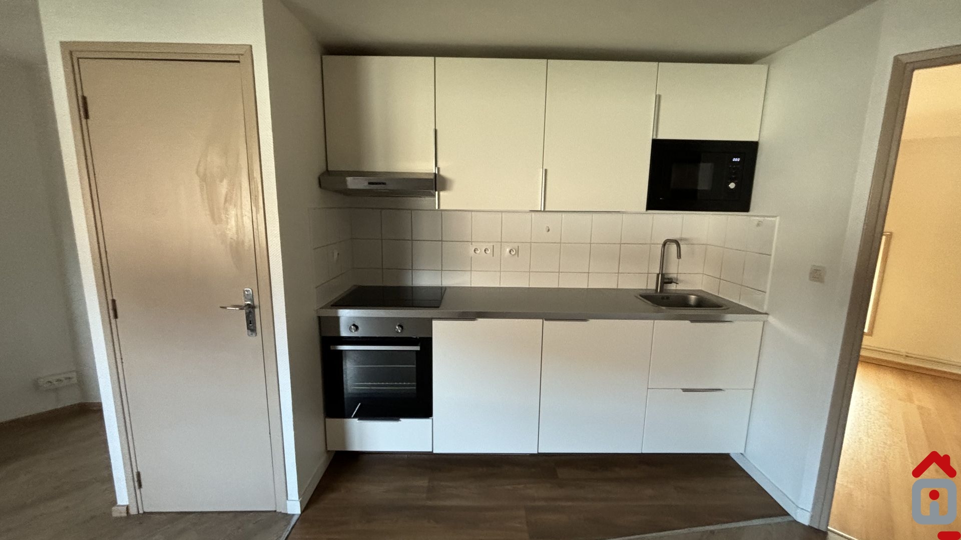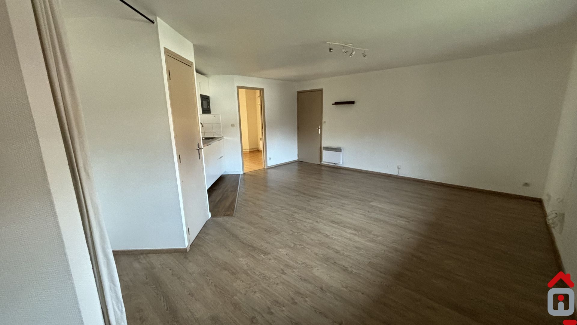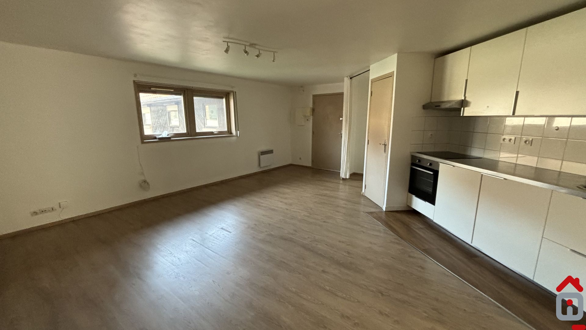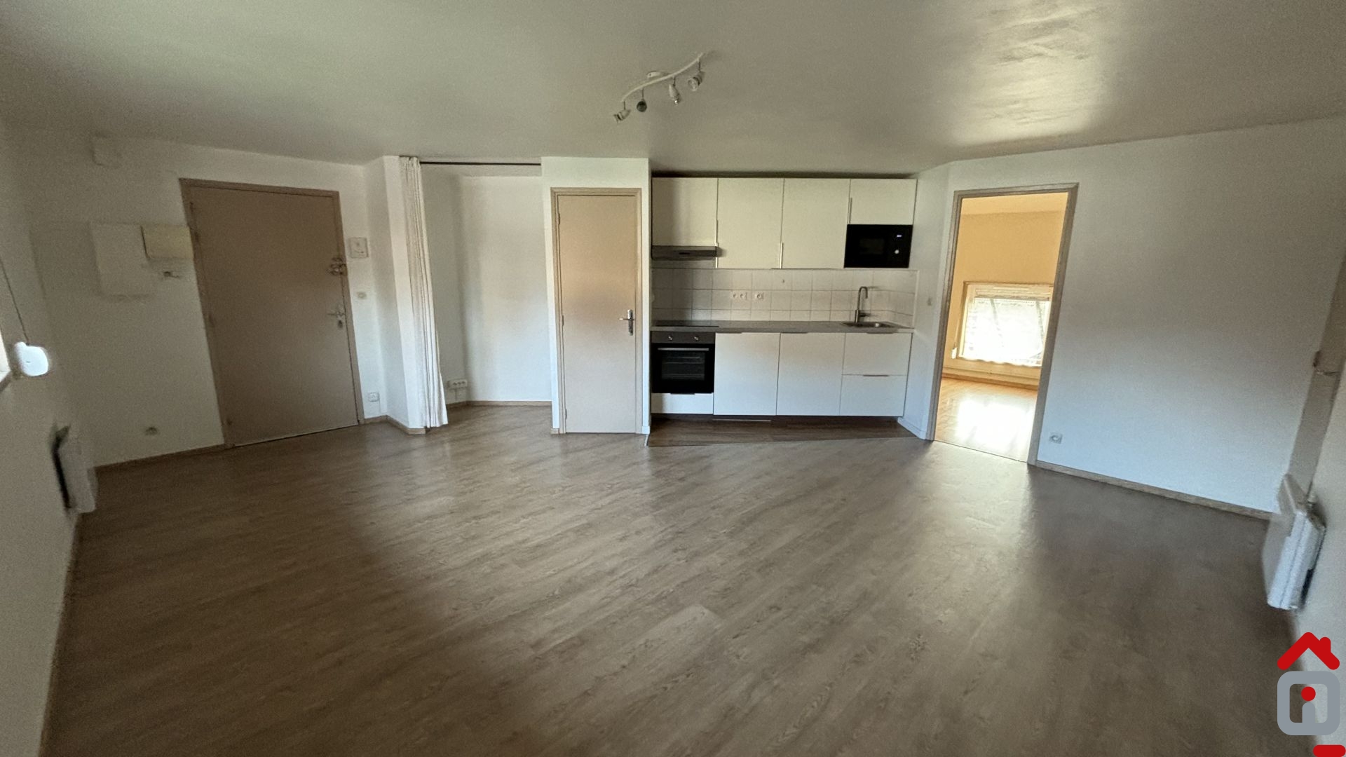 Entrée, vaste pièce à vivre avec cuisine équipée ouverte (meubles, four, plaque, hotte aspirante et micro ondes).