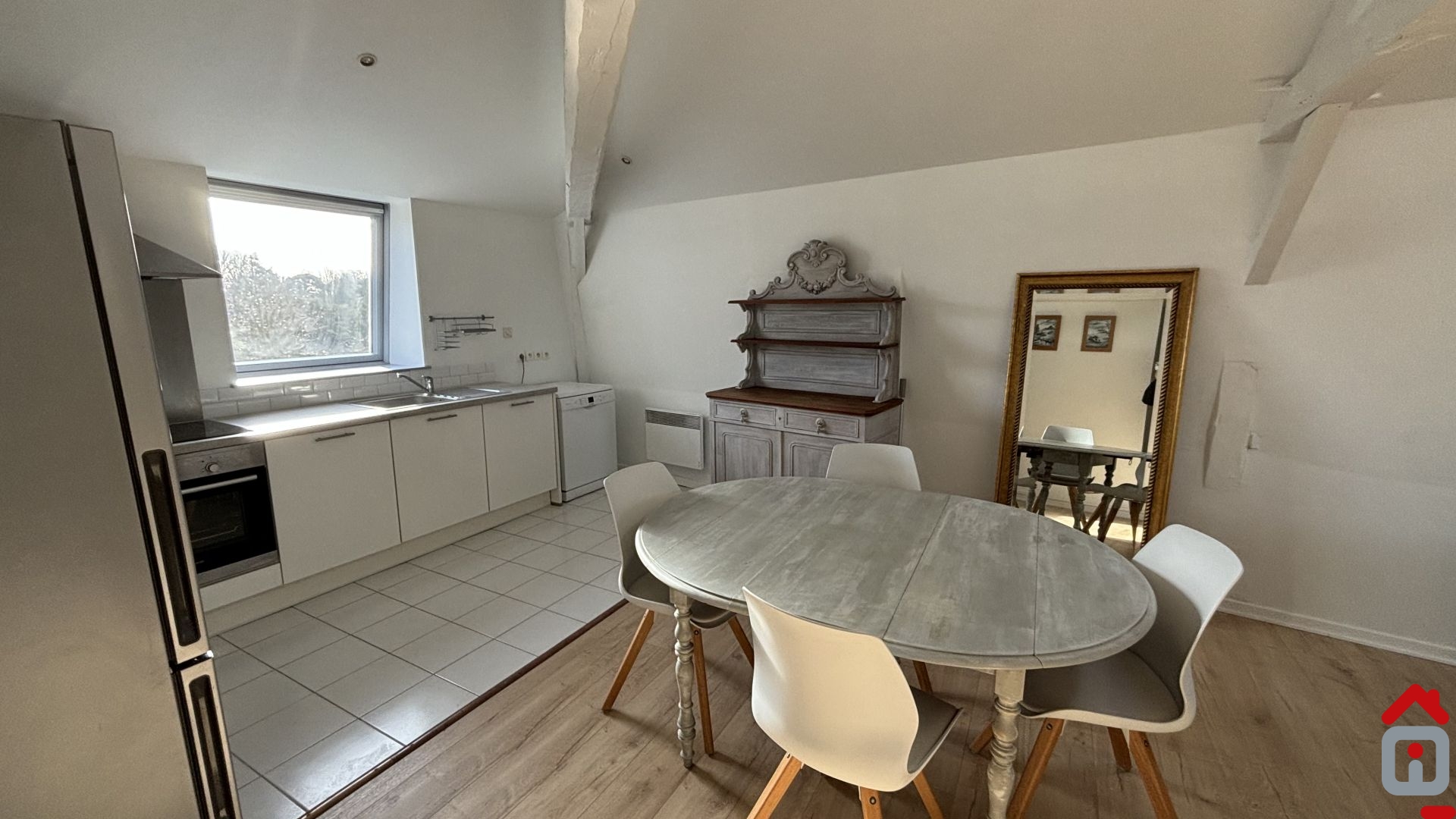 Outre les éléments de cuisine, l'appartement dispose des meubles suivants: table salle à manger, 4 chaises, canapé d'angle convertible, table basse, meuble TV, lit double, vaisselier, 2 colonnes de rangements et 2 meubles supplémentaires.