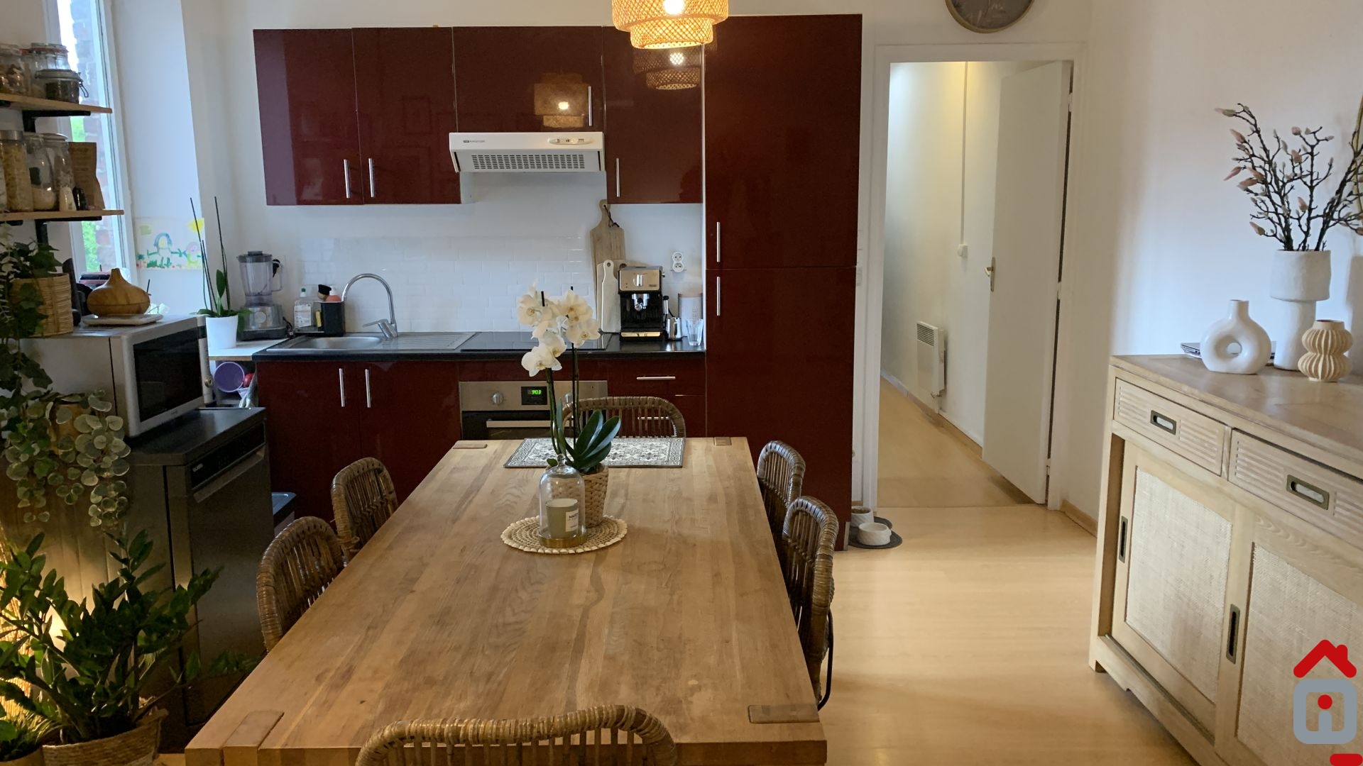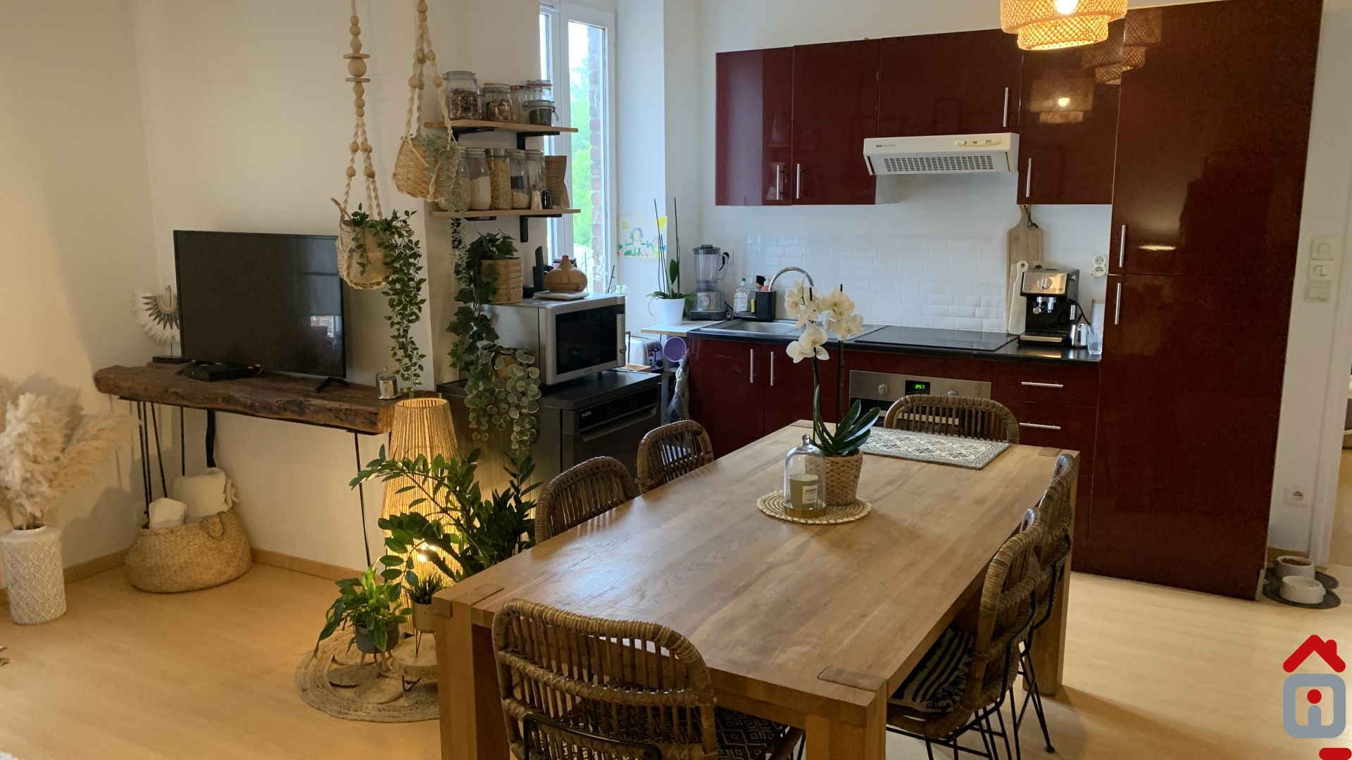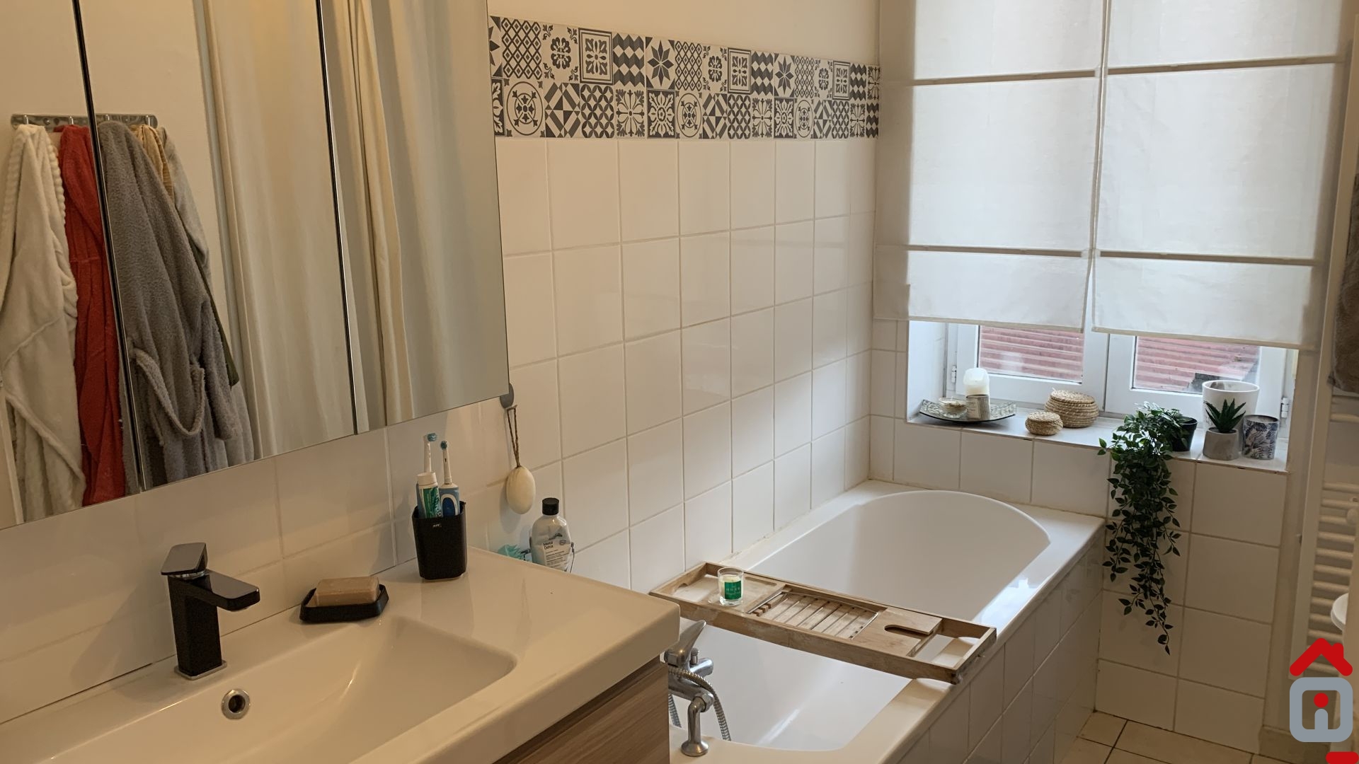 Séjour avec cuisine équipée ouverte (meubles, hotte, plaques, four, frigo), salle de bains avec baignoire, wc séparé, 2 chambres.