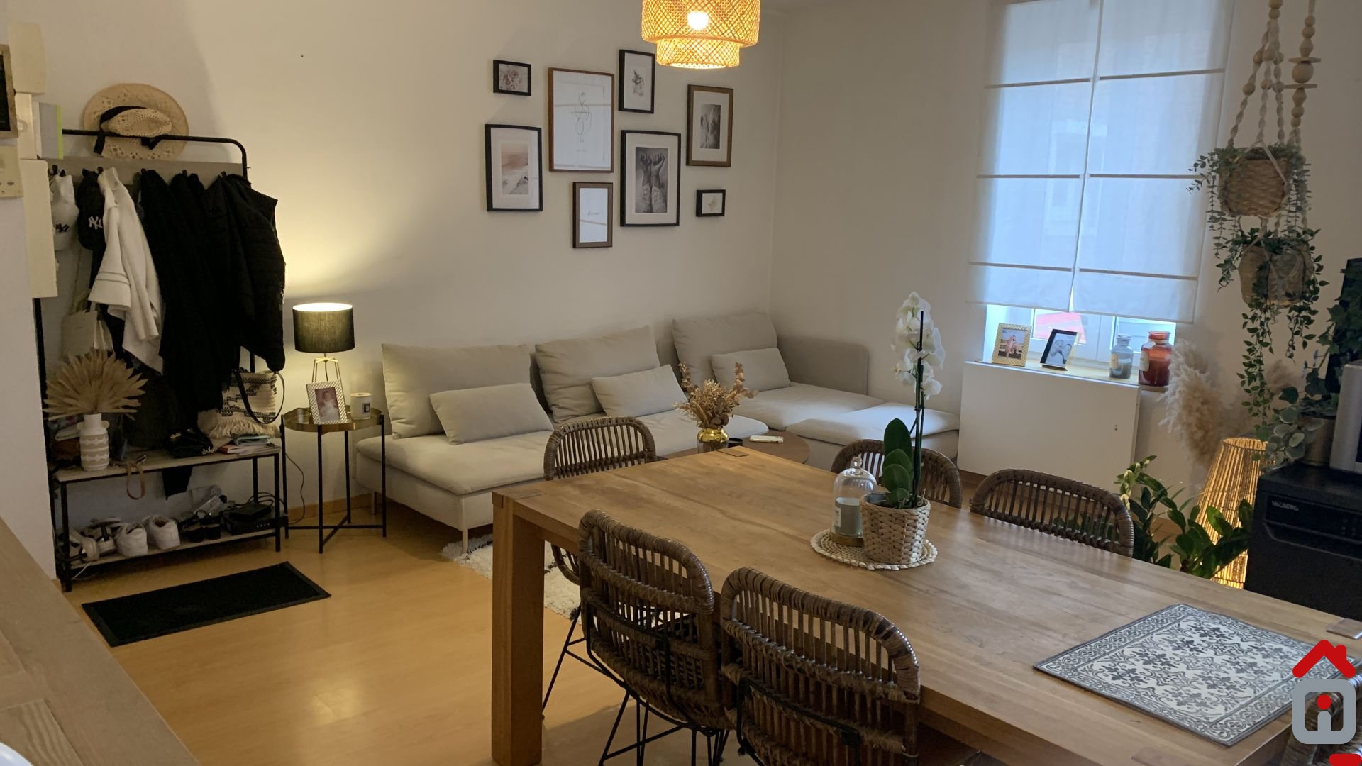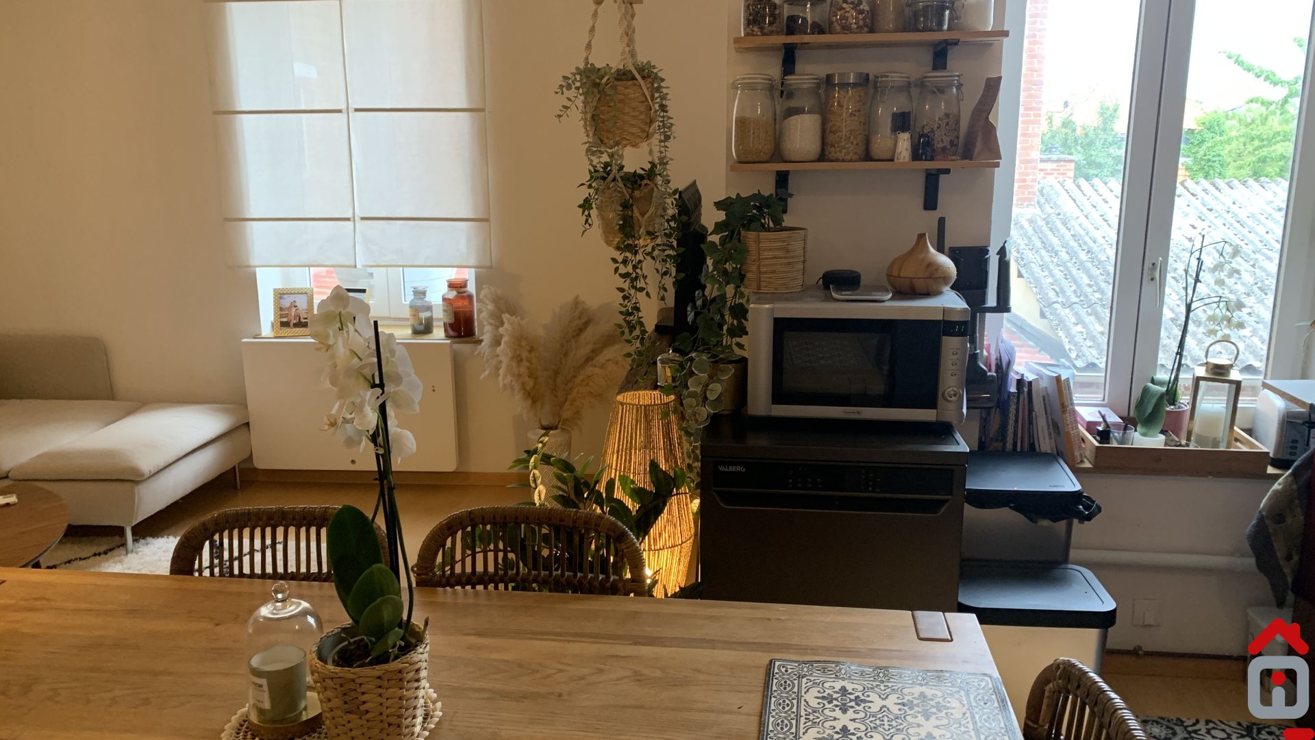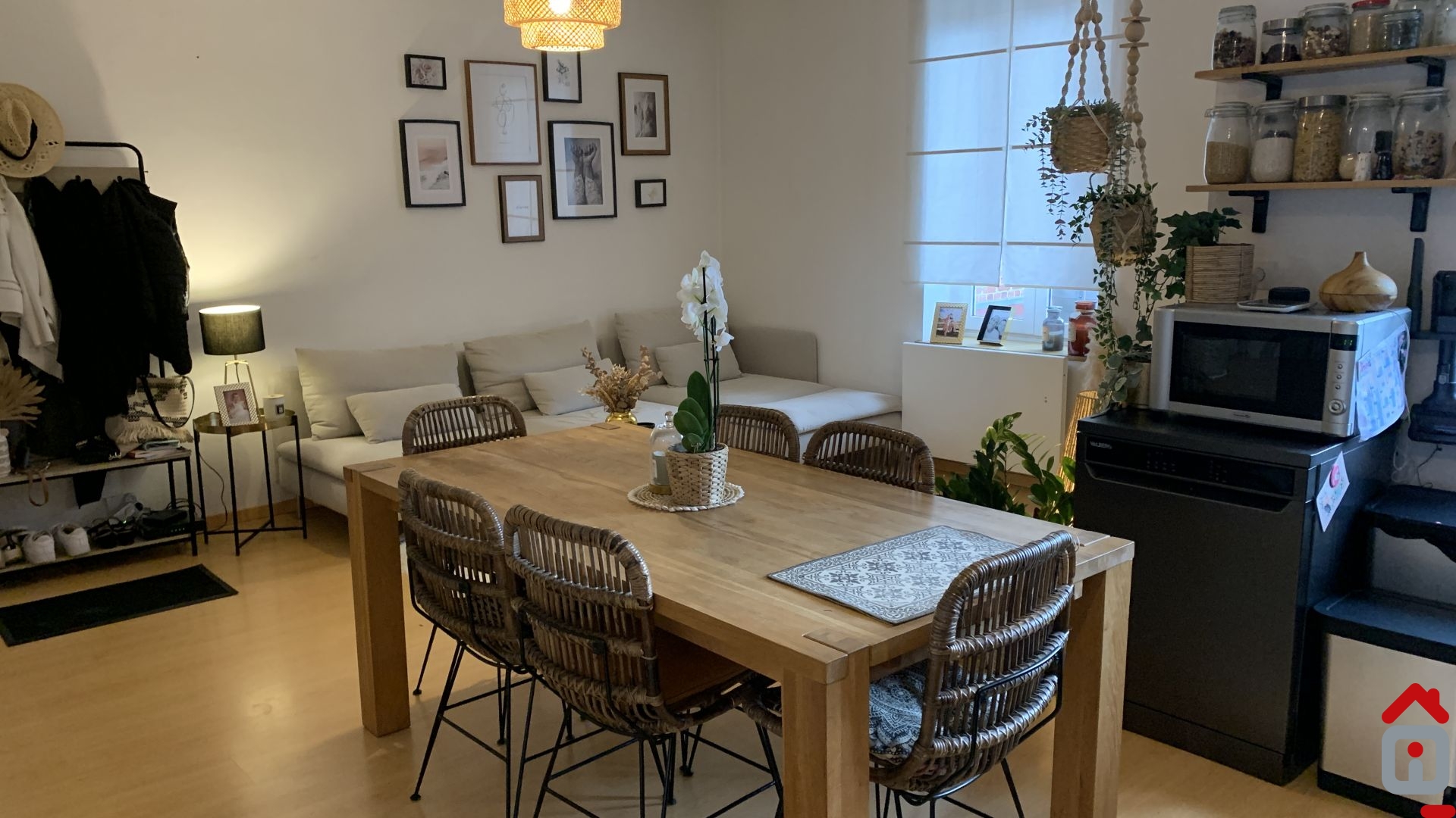 Séjour avec cuisine équipée ouverte (meubles, hotte, plaques, four, frigo), salle de bains avec baignoire, wc séparé, 2 chambres.