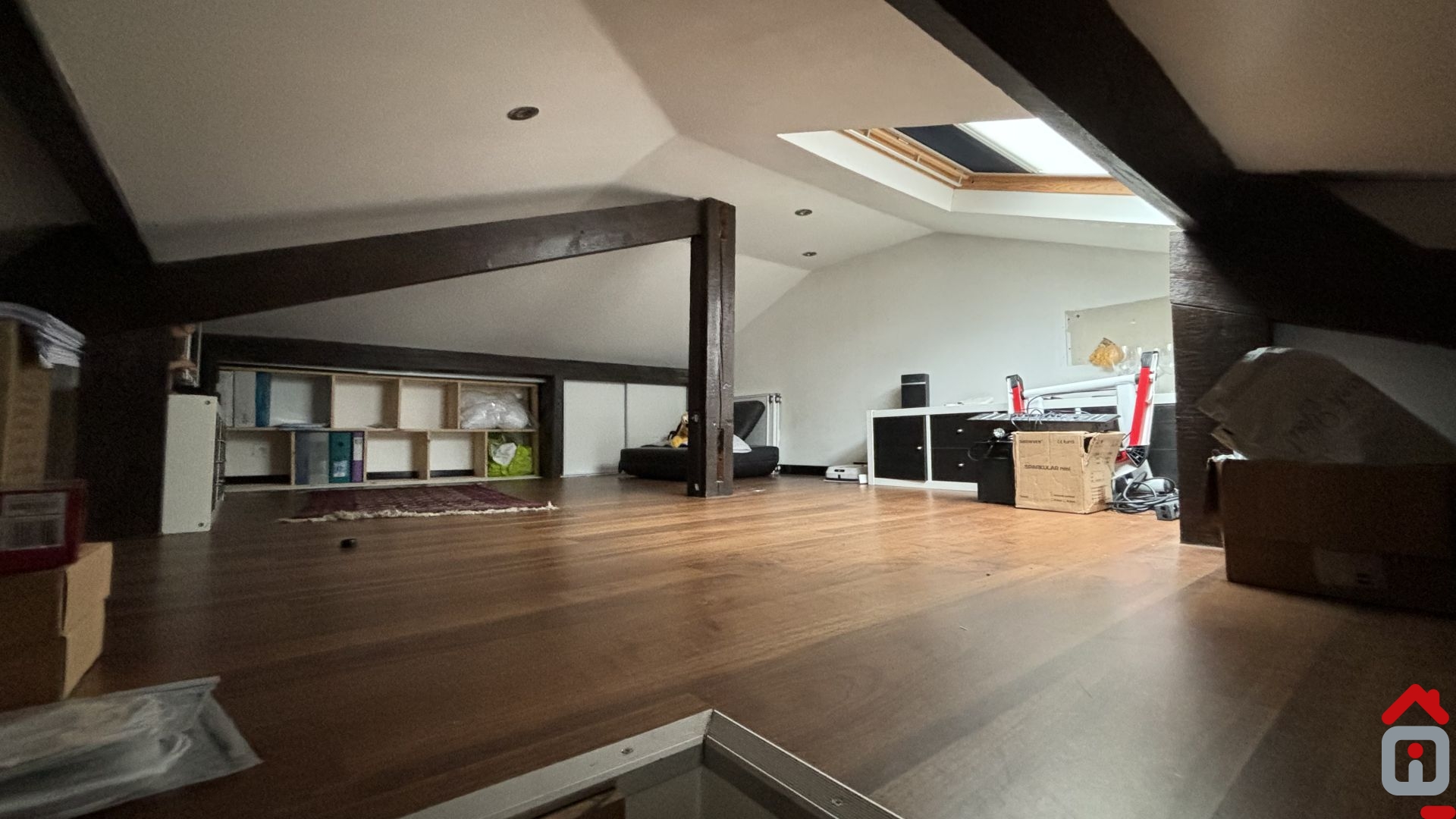 Entrée avec vestiaire, bureau (ou dressing), 1 très belle chambre de 16,40m² avec rangement, toilettes séparés, salle de bains équipée d'une baignoire et douche, vaste séjour avec cuisine équipée ouverte (meubles et électro ménager) + poêle à granules, le tout pour + de 36m², espace nuit avec mezzanine.